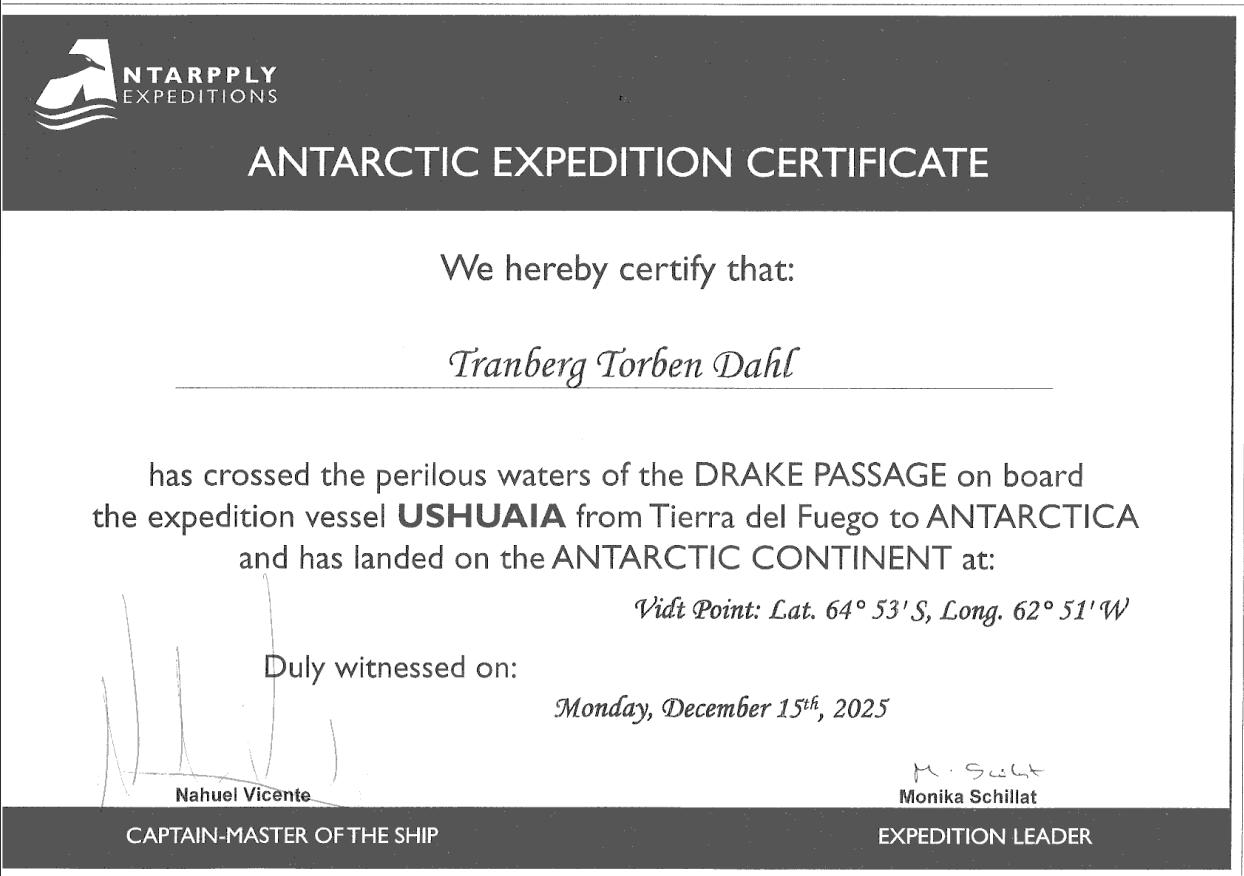 Først 2 dage på åbent hav, Drake Passage. Dernæst 4 døgn i stille farvand omkring den nordlige halvø, hvor vi var på fastlandet Antarktis 2 gange samt på 3 øer i alt. Derudover var vi på 4 sejlture i gummibåde med påhængsmotor. Så igen 2 dage på åbent hav tilbage til Argentina. Det var en fantastisk og næsten ubeskrivelig oplevelse, og det er nok kun denne ene gang vi får besøgt dette kontinent, derfor er der mange billeder i næste mappe. Billeder: Antarktis |